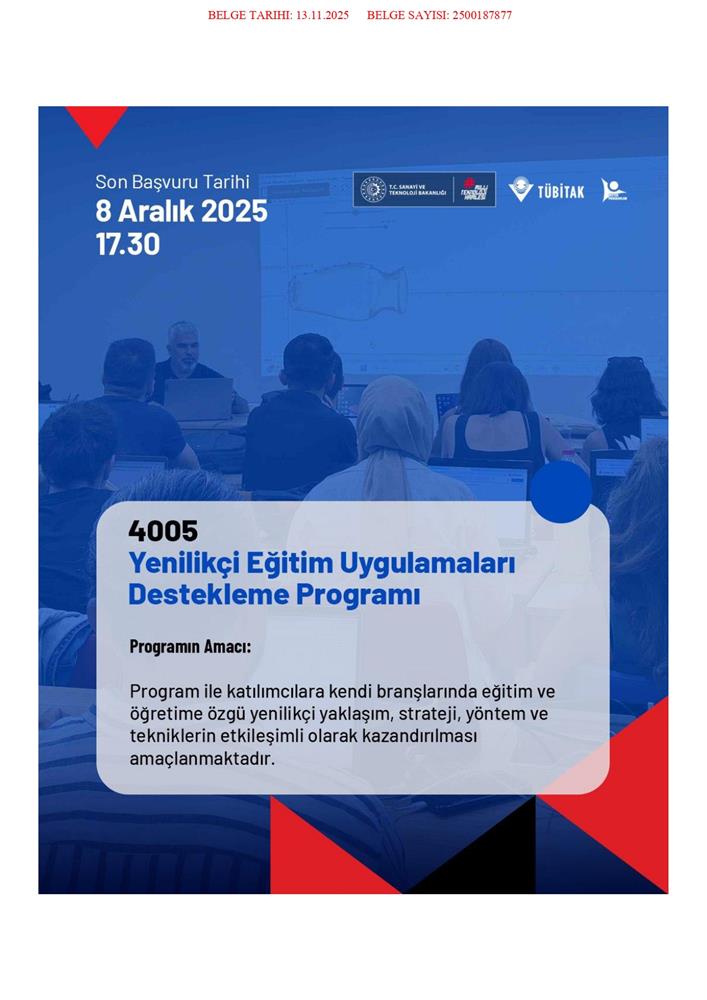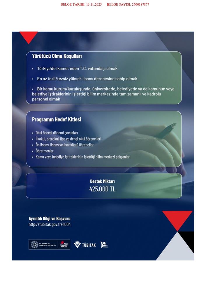 Mühendislik Fakültesi olarak; bilim iletişimi, yenilikçi öğrenme ortamları ve eğitim gelişimini destekleyen TÜBİTAK 4004 – Doğa Eğitimi ve Bilim Okulları ile TÜBİTAK 4005 – Yenilikçi Eğitim Uygulamaları programlarına proje başvurularını destekliyoruz.
